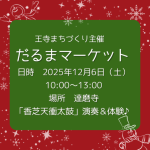 ■開催日 2025年11月15日(土) ■開催時間 11:00~18:30 【ご案内】 縁日遊び・ワークショップ・謎解き・こどもカフェを開催します。 11月はミルキーウェイでの出張だるまマーケット! 会場は「王寺北義務教育学校グラウンド」